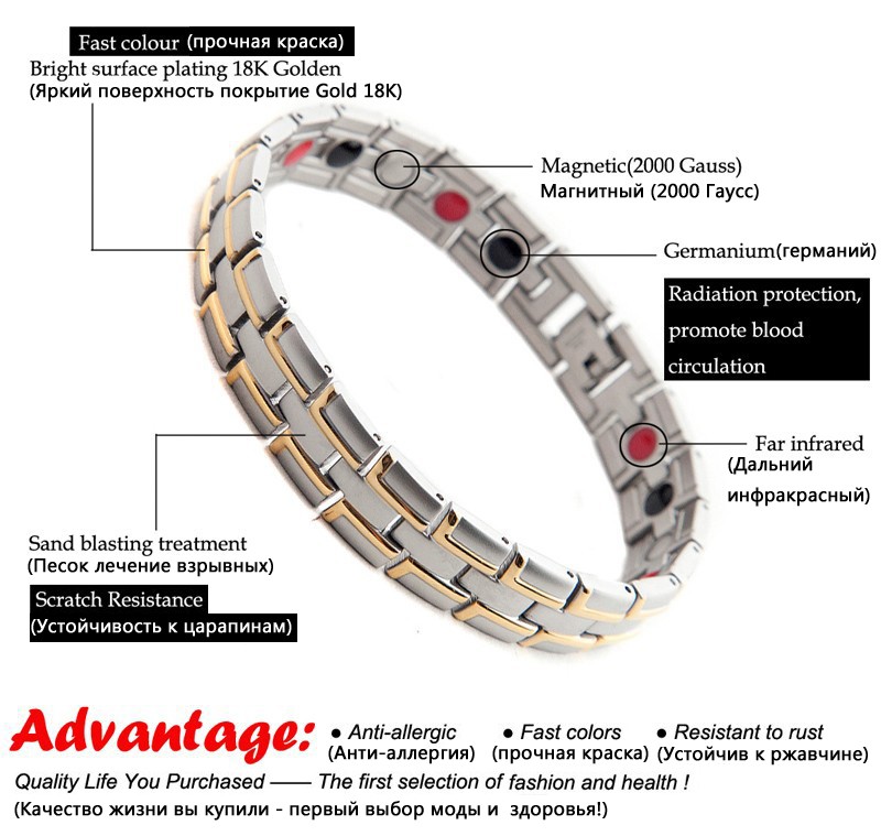 Healing Magnetic Bracelet Men/Woman 316L Stainless Steel 3 Health Care Elements(Magnetic,FIR,Germanium) Gold Bracelet