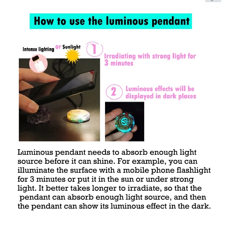 This pendant is luminous, ie it glows in the dark. To get this effect, the pendant need to absorb enough lght, eg from the sun or your mobile phone (torch/flashlight function). You can leave it under the sun for a few minutes.