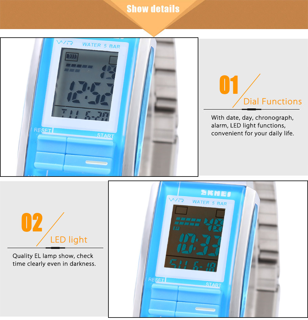 Alarm, Auto Date, Back Light, Chronograph, Water resistant - 50M. Date, LED display, luminous