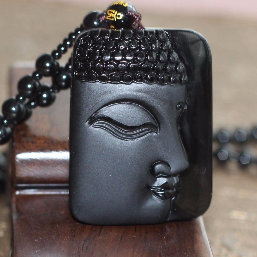 Natural Obsidian Black Buddha Head Pendant with Free Bead Necklace