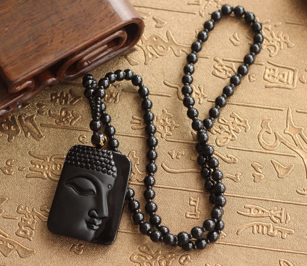 Natural Obsidian Vintage Necklace Black Buddha Head Pendant