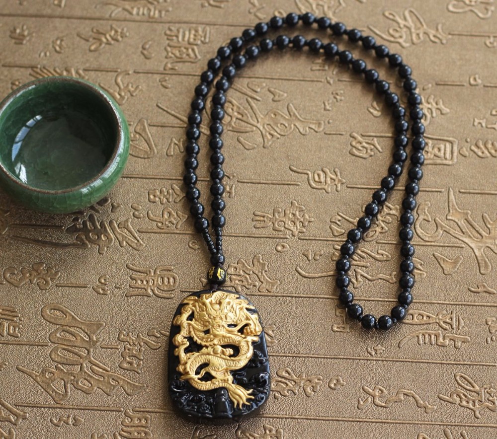 Gold Natural Black Obsidian Carving Dragon Lucky Amulet Pendant with free Bead Necklace