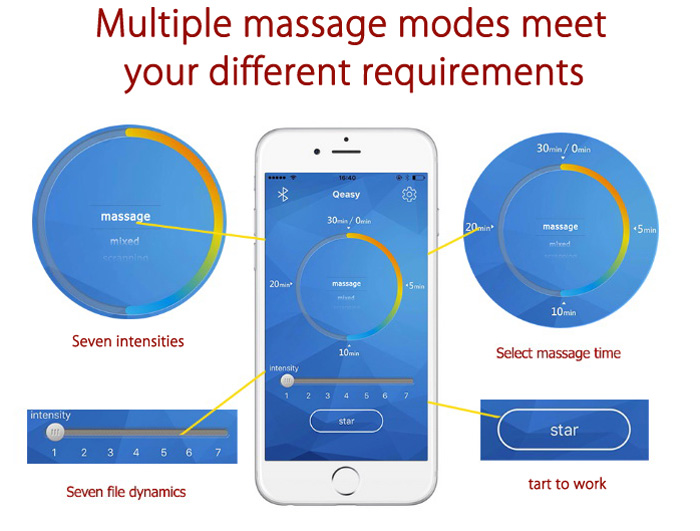 - 6 massage modes: Rhythmic tapping, Scraping, Massaging, Acupressure, Cupping, Acupuncture, auto, free to choose