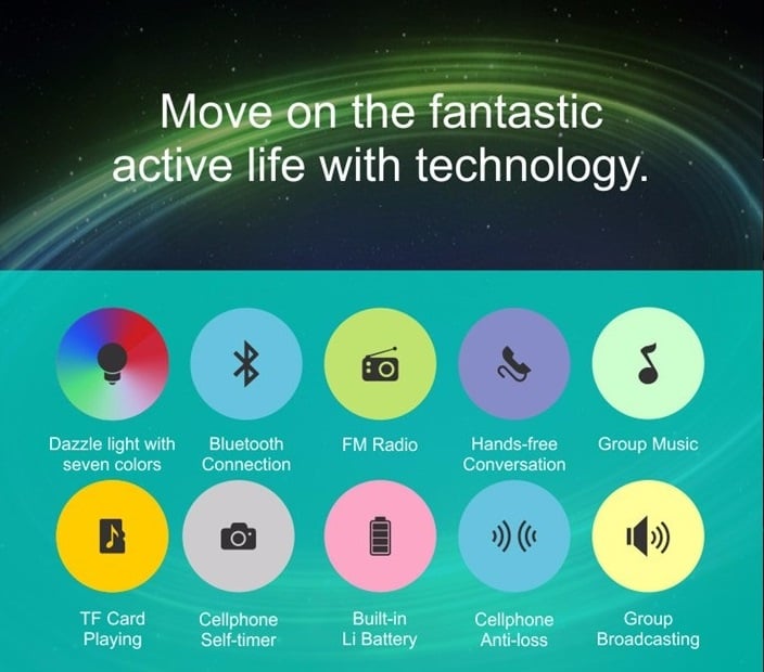 Function: Bluetooth/Hands-free call/TF card play/Flashing light/FM radio/Anti-lost