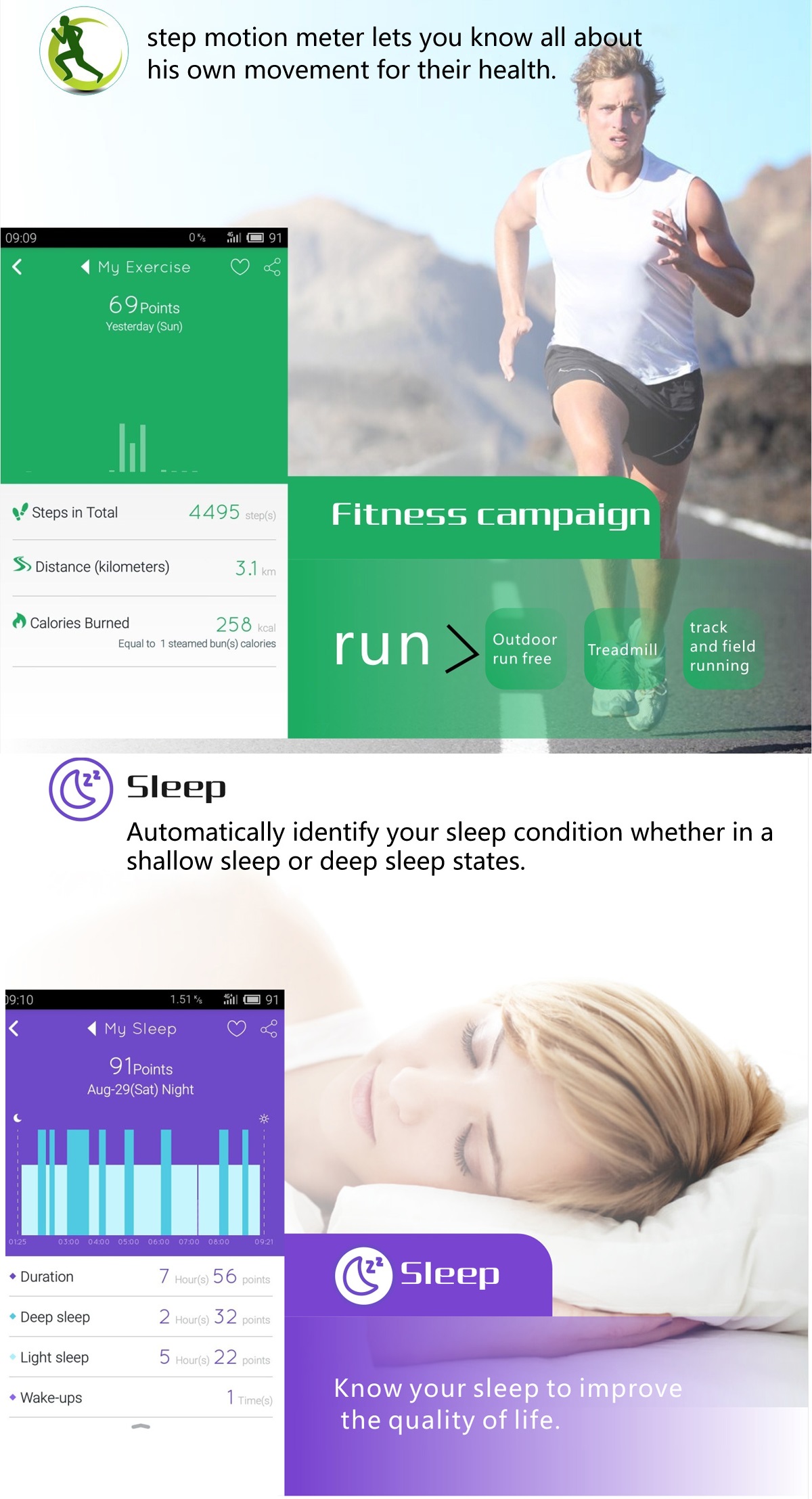 • Sleep monitoring: Show your deep sleep time, shallow sleep time and wake time with intuitive graph, help you develop a regular sleeping habit.