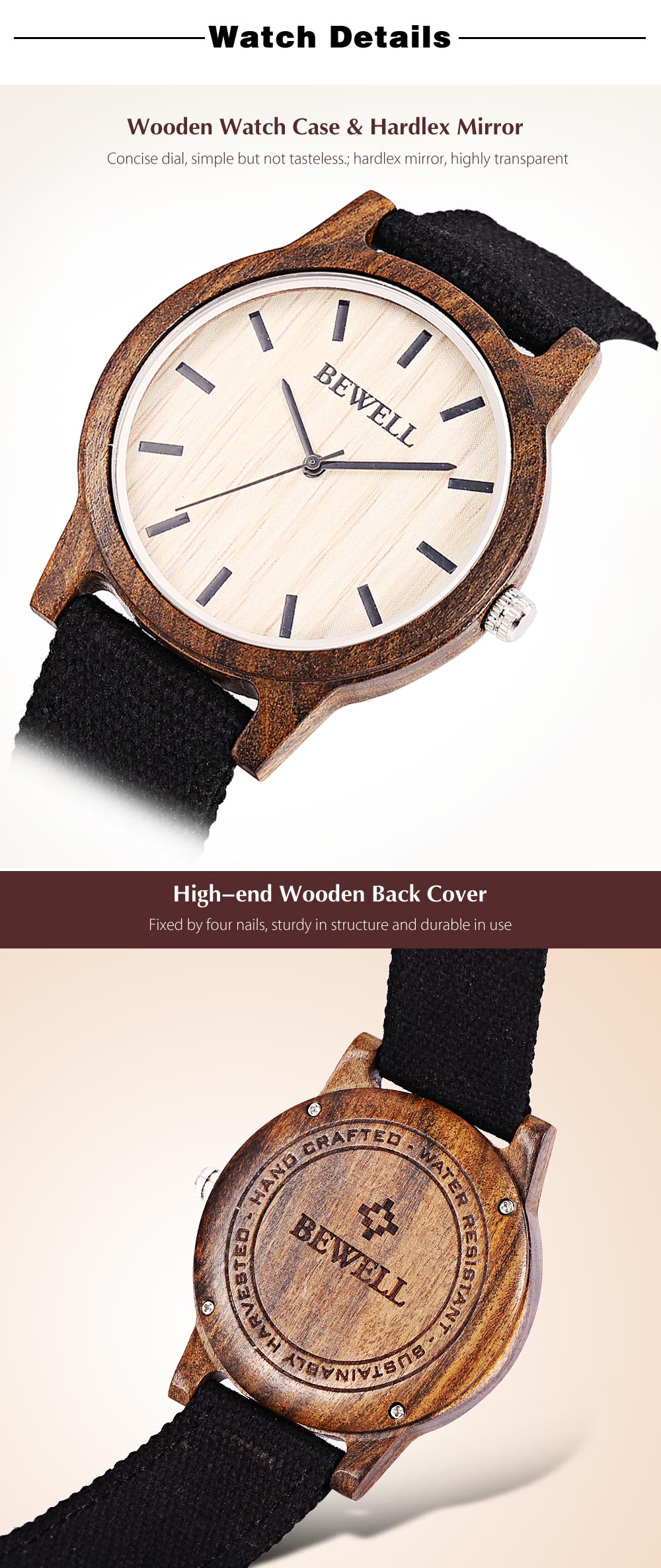 Bewell ZS Unisex Quartz Watch Japan Movt Wooden Case Canvas Band Wristwatch