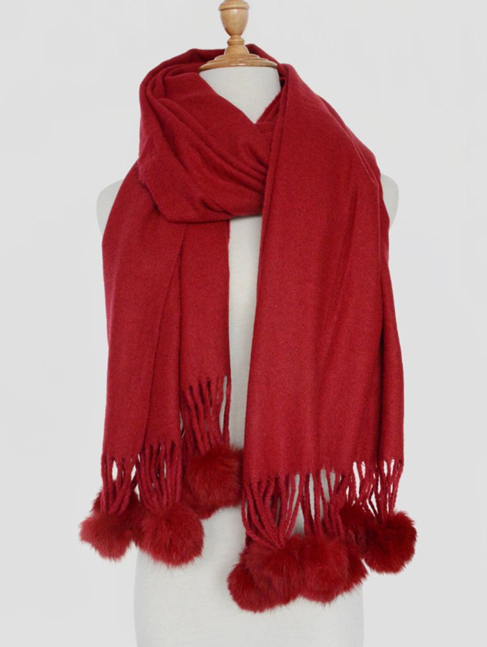 Fuzzy Ball Pendant Shawl Scarf - Wine Red