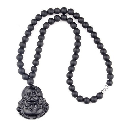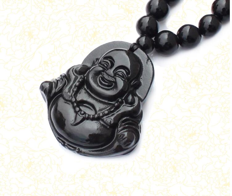 Natural Black Bian Stone Carved Lucky Laughing Buddha Pendant Beads Necklace Massager