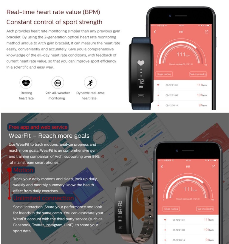 Arch provides heart rate monitoring simpler than any gym bracelet. Using 2nd generation optical heart rate monitoring method unique to Arch gym bracelet, it can measure heart rate easily, conveniently, and accurately. Giving a comprehensive knowledge of the all-day heart rate conditions, with feedback of current heart rate value, so that you can improve your efficiency.