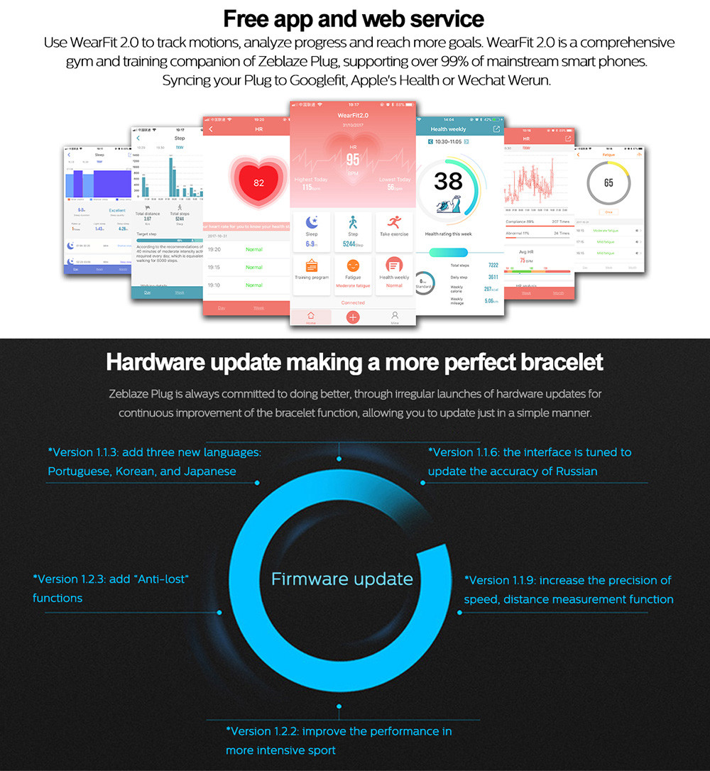 Use WearFit 2.0 to set goals and track progress. WearFit 2.0 is your gym companion with the Zeblaze Plug, supported on most smart phones. Or sync your Plug to Googlefit, Apple's Health, and Werun.