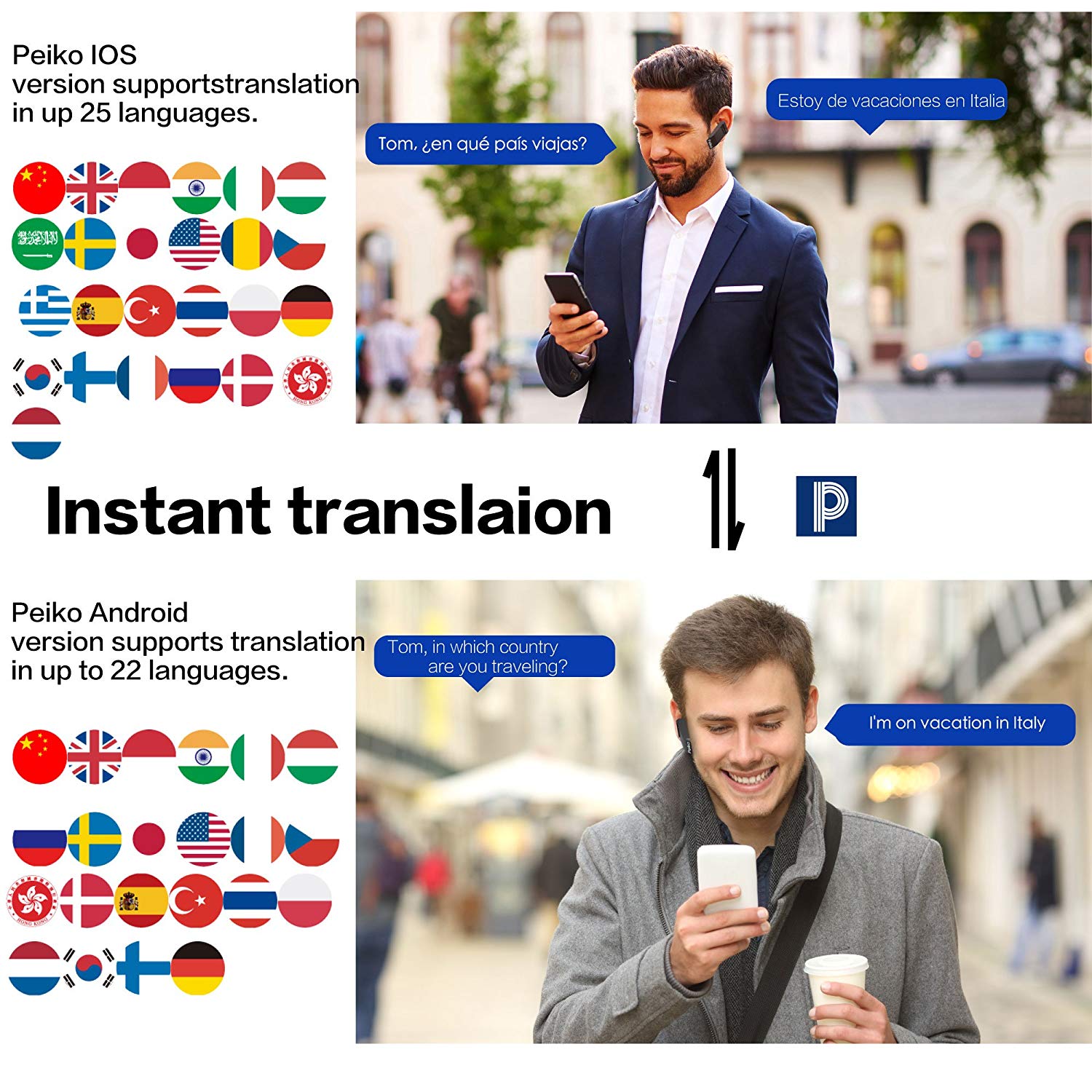 • Multiple Languages Translation: Support up to 16 languages translation, such as English, Chinese, Japanese, etc. Speak to the earphone, then it will translate into the voice of the country you want.