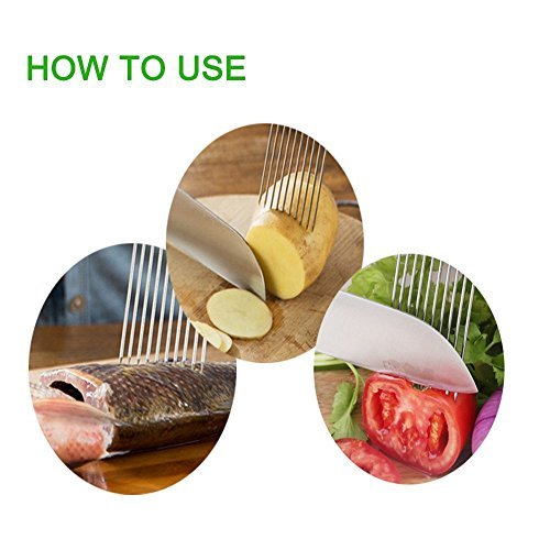 Just pierce the potato/onion/apple with the stainless steel prongs and slice between them to create uniform, even slices.