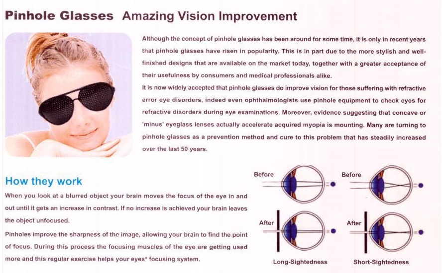 Frequent substitute of prescription glasses (TV, computer, reading) with pinhole glasses will result in improved vision, natural and drug-free way. Wearing for 15 minutes one day will help to improve your eyesight within 2-6 weeks.