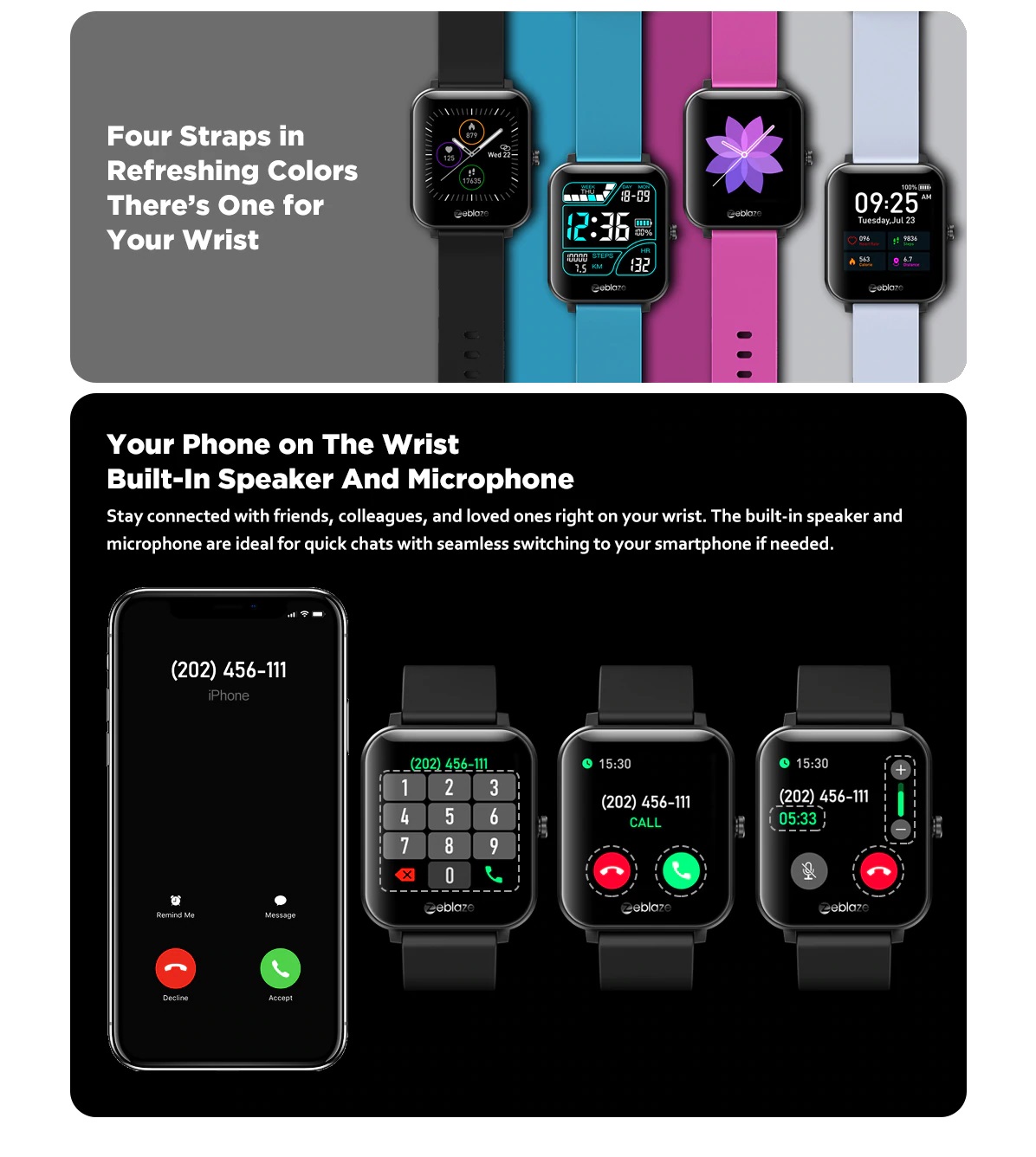 GTS Zeblaze smart bracelet supports bluetooth calls, it can stay connected with others on your wrist, that means you can receive or make a phone call on the watch. And it is equipped with a larger screen and can set more than 60 dials, 4 color straps to define your uniqueness.Heart rate, blood pressure, blood oxygen, steps, mileage, calories, everything you want to know, it can tell you.