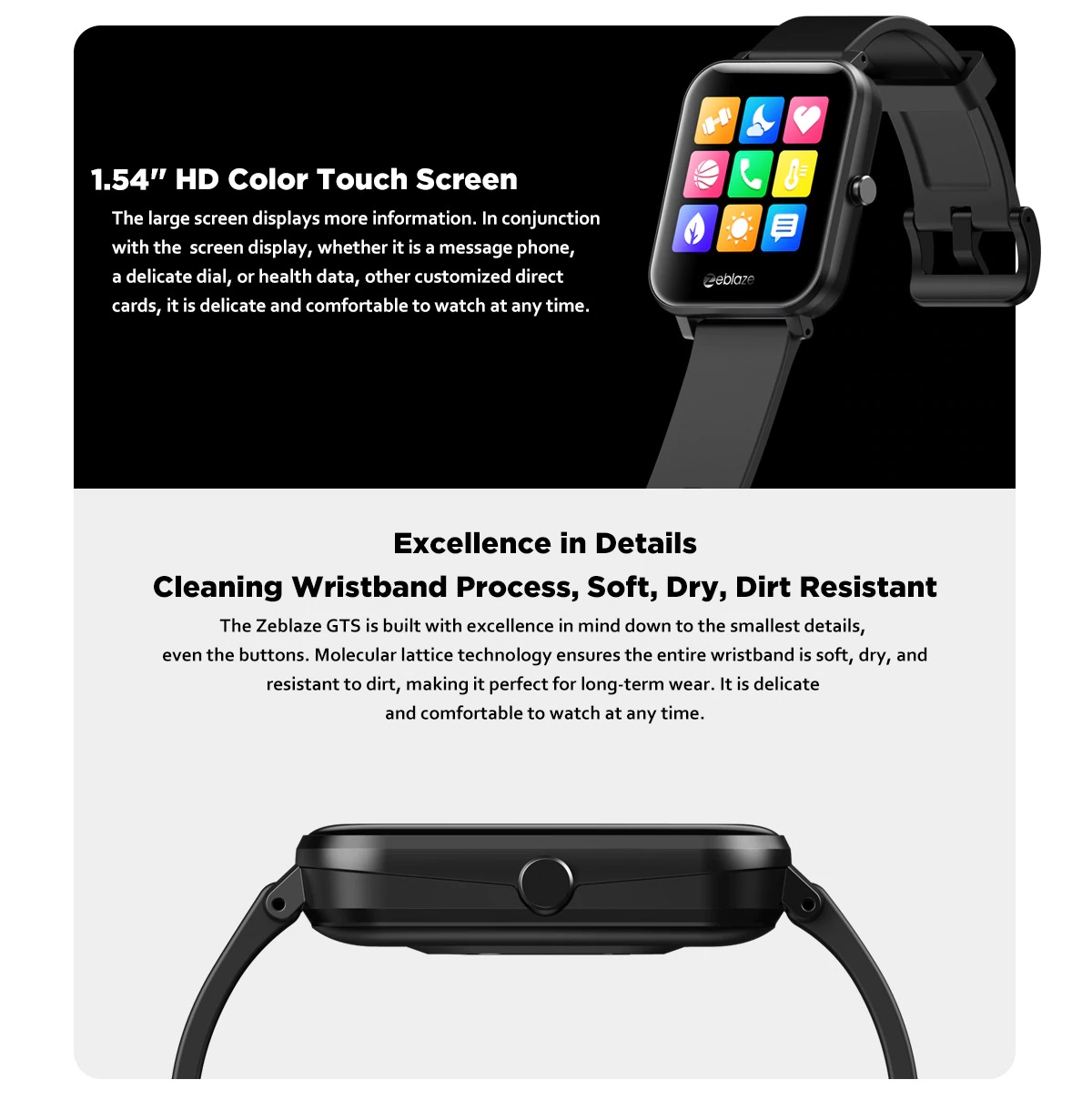 Zeblaze GTS smartwatch is comfortable to use thanks to a large 1.3-inch high-quality IPS screen.Another distinguishing feature of this watch is the newest strap, developed using molecular lattice technology, which stays dry and clean.