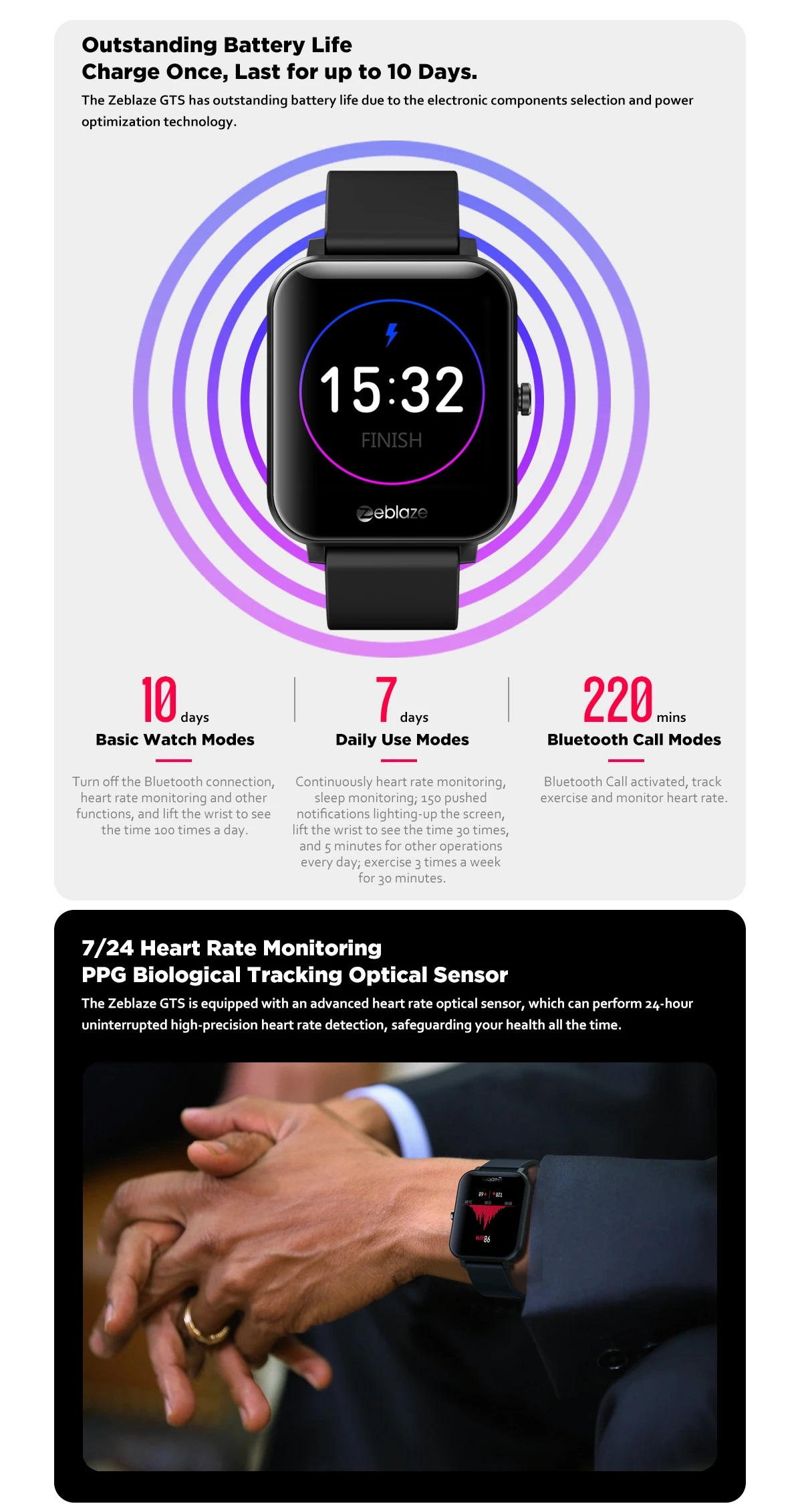 Battery Life: 10 days (Basic watch mode); 7 days (Daily use mode); 220 mins (Bluetooth Call Modes)