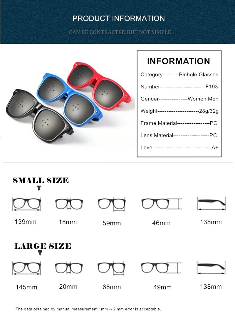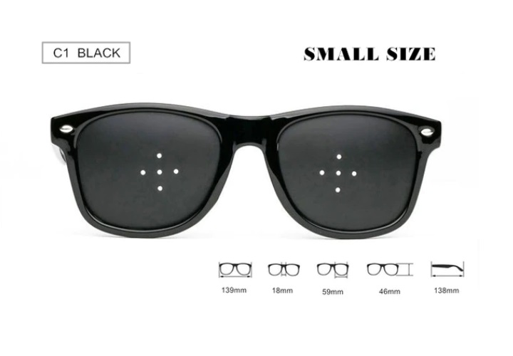 Pinhole glasses are a type of corrective glasses that do not use a lens. Theory is very simple: when the eyes can only look through the small holes, they naturally change focus to a relaxing standard, so the eyeballs are relieved from the previous nervous focus.